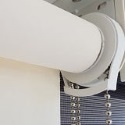 Controleer of het doek niet naar links of rechts naar de steun rolt. Rolt het doek naar links, rol dan volledig af en plak dan rechts op de buis een strook je van 5 cm schilders tape.
